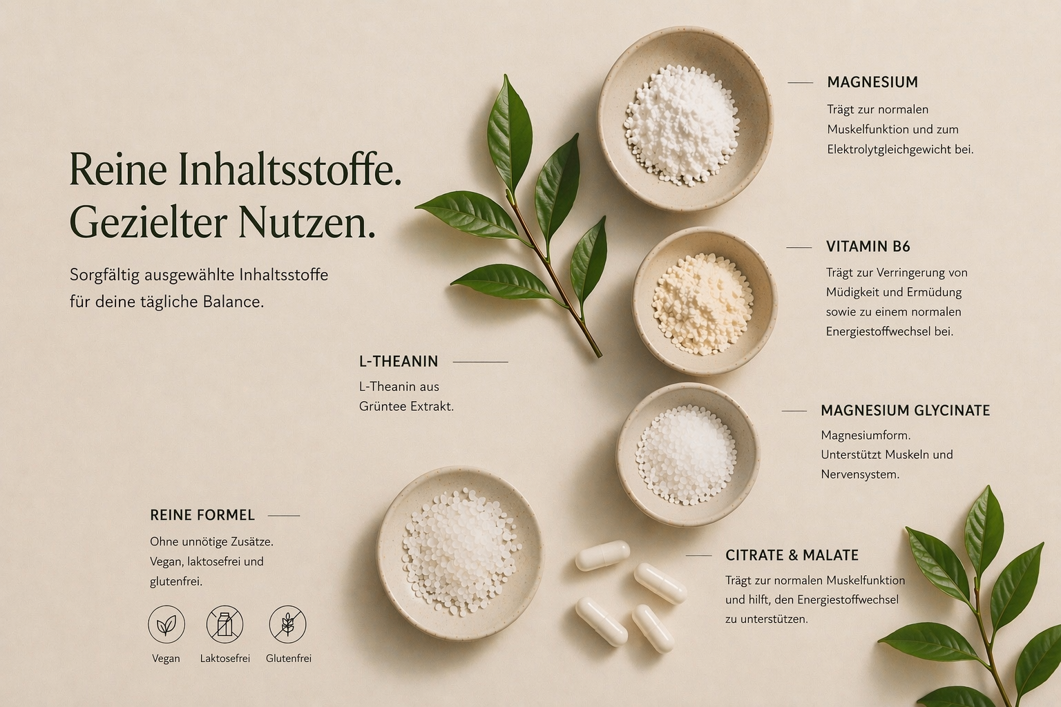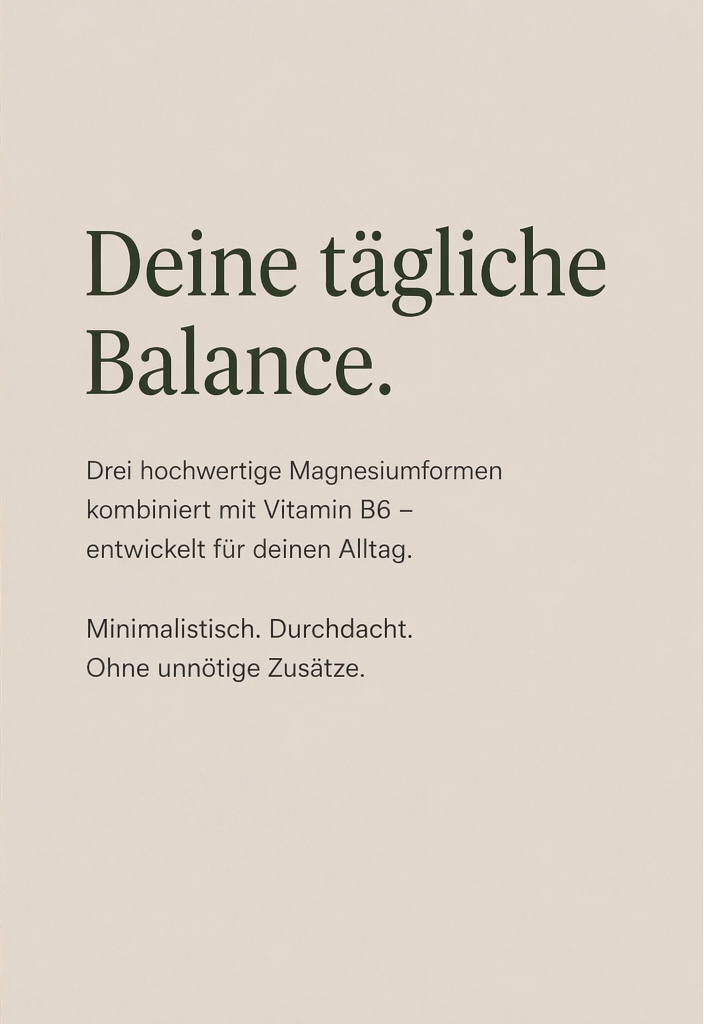 Wir glauben, dass Qualität vor Quantität steht. Deshalb setzen wir auf klare Rezepturen mit wenigen, gezielt eingesetzten Komponenten – darunter verschiedene Magnesiumformen, ergänzt durch sorgfältig ausgewählte Mikronährstoffe.